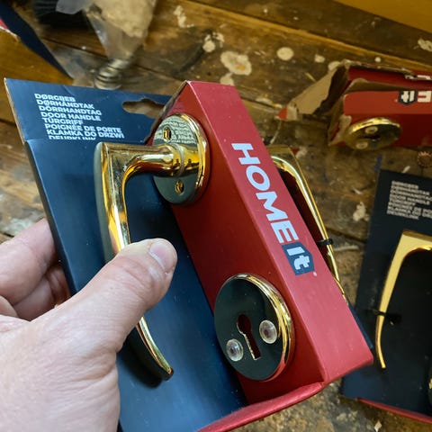 Sættet inkluderer to håndtag og tilhørende nøgleskilt.