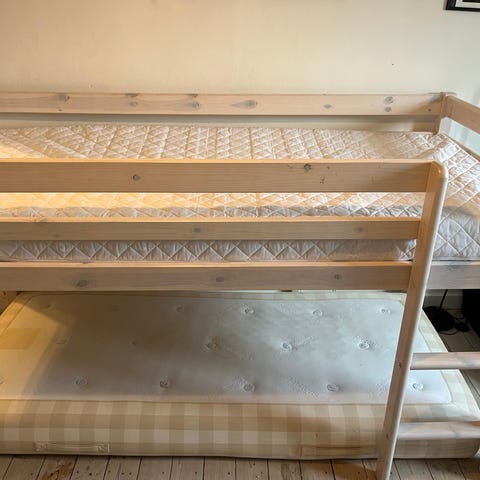 Halvhøj seng fra Flexa med legeforhæng i jungletema. Måler 90x200 cm og 120 cm i højden. Brugt, men i fin stand, få brugsspor. Er skilt ad for nem afhentning. Madras kan følge med, hvis det ønskes. Afhentes i Korsør.