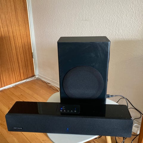 Orbitdound Soundbar med subwoofer. Sort farve. Designet til at forbedre lydoplevelsen ved tilslutning til tv eller andre lydkilder.