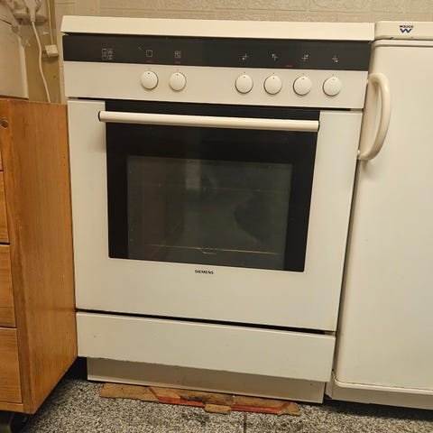 Bosch induktionskomfur med glaskeramisk kogeplade og ovn. Komfuret har fire induktionskogeplader og betjenes via knapper og touchpanel. Farven er hvid.
