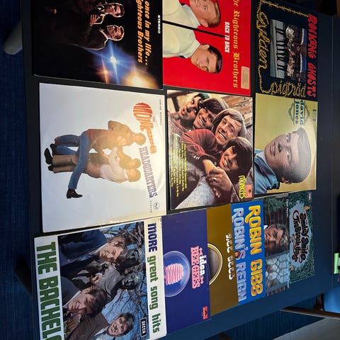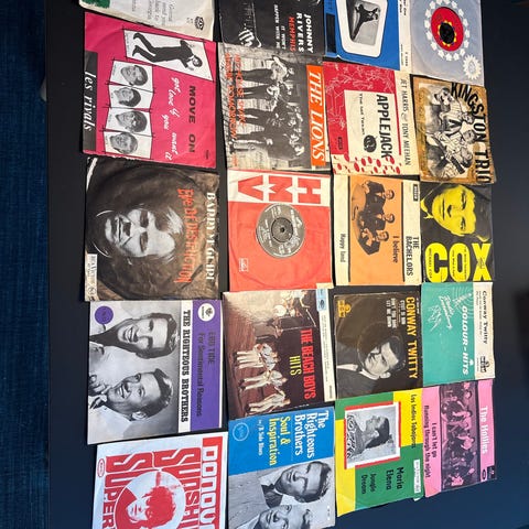 Samling af diverse vinylplader med forskellige musikgenrer og kunstnere. Pladerne varierer i størrelse og farve, og materialet er vinyl.