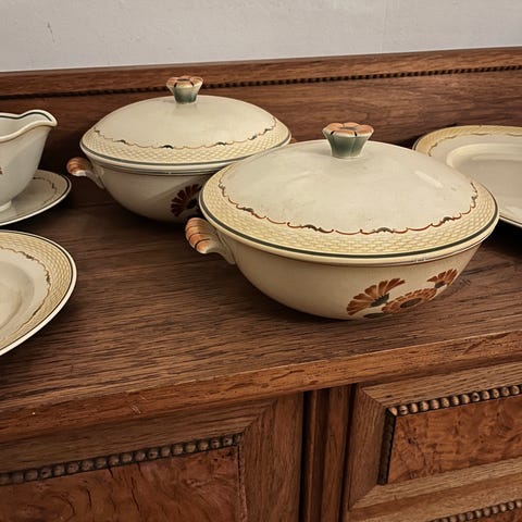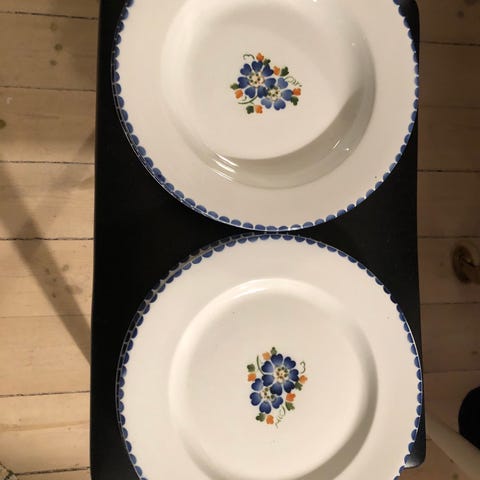 3 fade,2 små skåle,1 sovsekande,1 terrin med låg, 2 terriner uden låg, 8 flade tallerkener, 12 dybe tallerkener,m.m. Kantafslag og misfarvinger