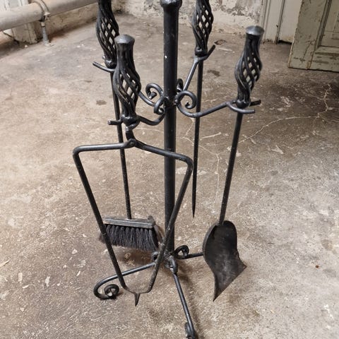 Pejsesæt af sortmalet jern. Brugt, men i pæn stand. Højde stativ 62 cm.