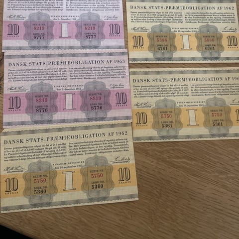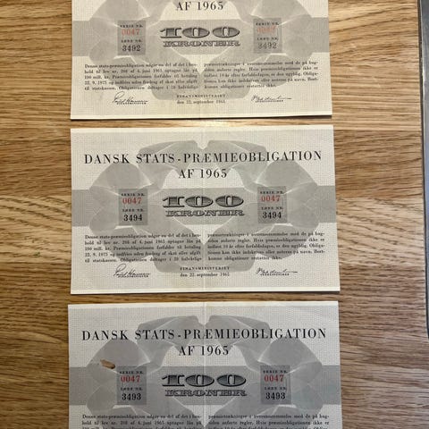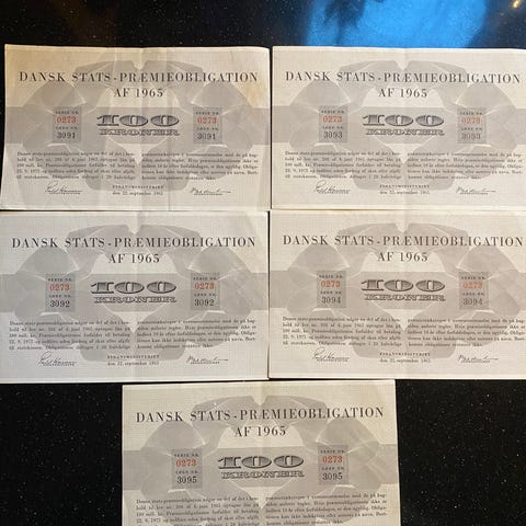 Dansk Stats Præmieobligation fra 1948 og 1954 samt 1959 med pålydende værdi 50 kroner. Endvidere en fra 1965 og to fra1977 værdi 100 kroner. Obligationen er udstedt som en del af den danske statsgæld og indeholder specifikke serienumre og underskrifter. Anvendes som værdipapir og investeringsmiddel.