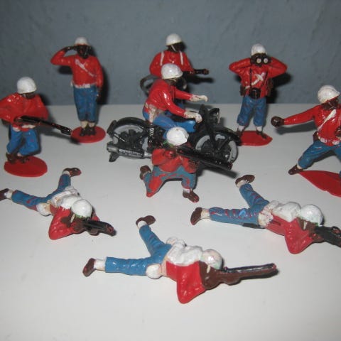 Samling af 13 soldaterfigurer i forskellige positurer og med forskellige våben. Figurerne er malet i rød og blå farve. Materialet er ukendt. Figurenes størrelse varierer, og de er velegnede til samling eller leg.