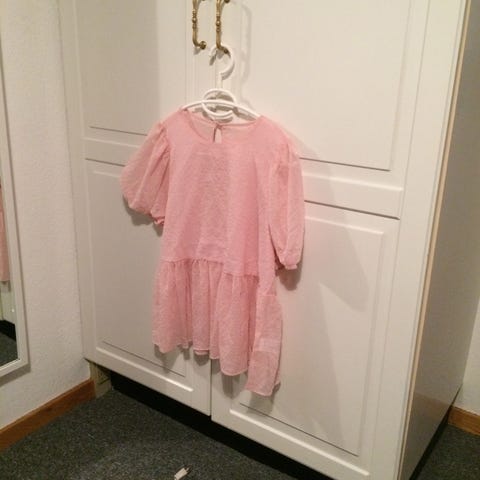 SHEIN, ensfarvet skjorte med rynket, buet kant.