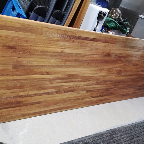 Fyrretræsbordplade Længde 301 cm, Bredde 63 cm, Tykkelse 26 mm, Har stået i garagen så lidt pletter men med let slibning er den klar igen.