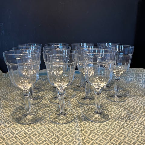 9 rødvinsglas, 7 hvidvinsglas og 5 drikkeglas med sød graveret bladranke. 250 kr. samlet eller 15 kr. pr. stk,