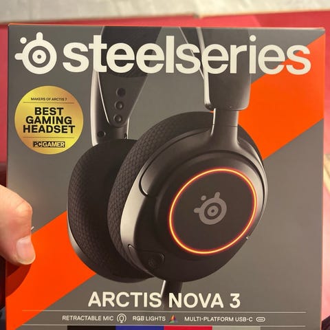 Sælger dette SteelSeries Arctis Nova 3 gaming headset. Det er et kvalitetsheadset med god lyd, komfortable ørepuder, RGB-lys og indbygget, udtrækkelig mikrofon. Kan bruges til PC, PlayStation, Nintendo Switch og mobil via USB-C.