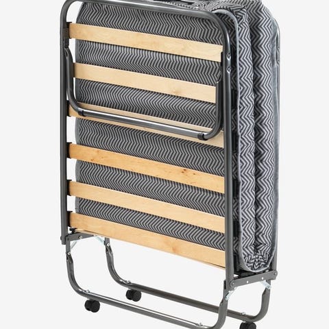 Stålramme, men er let. 7 cm tyk madras med en kerne af purskum. Med trælameller. Kan klappes sammen. B80 x L190 x H33 cm.
