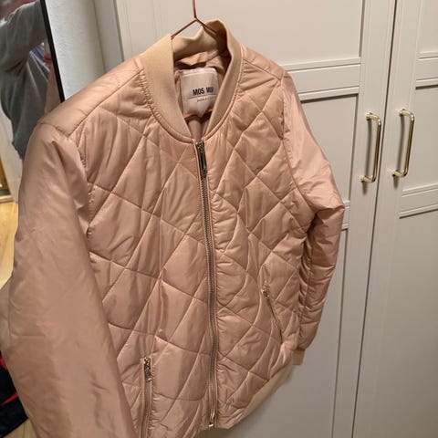 Mos Mosh jakke til kvinder i størrelse M. Jakken er beige og lavet delvis af bomuld. Den har mørkegrønne detaljer ved krave, skuldre og lommer samt knaplukning foran. Jakken har et let quiltet mønster og lommer med knaplukning. Ærmerne afsluttes med ribkant i mørkegrøn farve.
