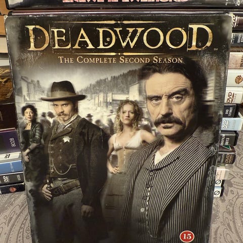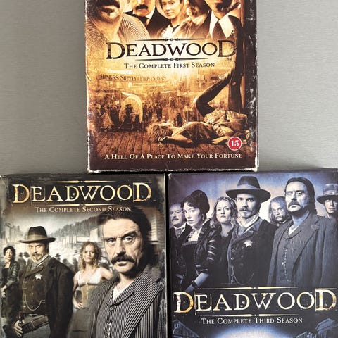 Deadwood Complete First Season DVD med flere diske. Serien foregår i en historisk westernby og indeholder alle episoder fra første sæson.