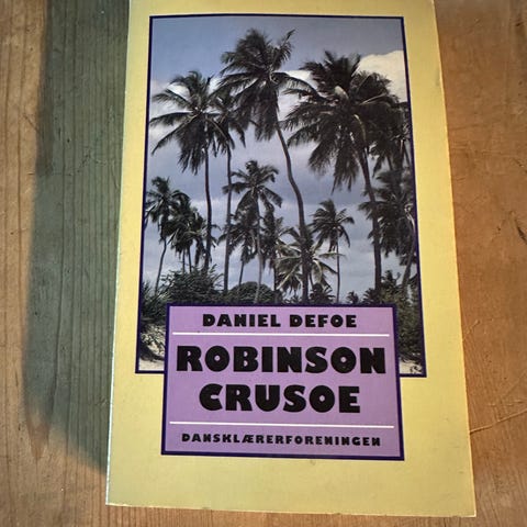 Daniel Defoe Robinson Crusoe bog med illustration på forsiden. Bogen indeholder historien om Robinson Crusoe og er udgivet af Fællesforeningen for Danmarks Brugsforeninger.