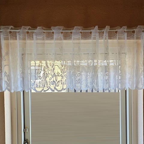Lille fin gardinkappe. Bredde på stangen: 116 cm. Højde på kappen: 30 cm. Stang og beslag medfølger. Kan sendes mod betaling af fragt.