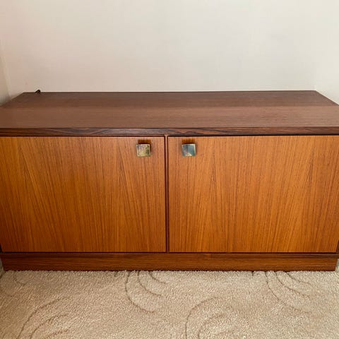 Skænk af palisander med to låger, indvendig grå Formica. Lidt nuanceforskel på topplade ellers rigtig fin. Udført hos Ulferts i Sverige. Se min anden annonce for tilhørende del