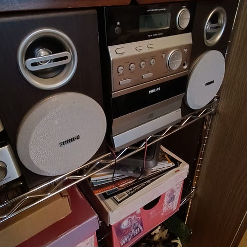 Den virker fint med radio, men er ret specifik på hvad type cd du prøver at afspille. Er gået lidt i stykker for neden (man kan fikse den med lim), men det påvirker ikke noget for brugeren👍Originale højttalere er med i prisen.