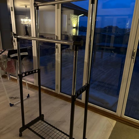 Fint brugt tøjstativ på hjul . Kan hæves og sænkes.