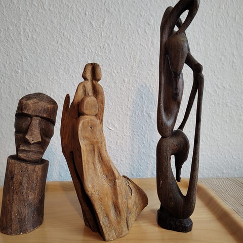 Håndlavet træskulptur med flettet design og naturlig træfinish. Dekorativt kunstværk, velegnet til indendørs brug som pynt eller samlerobjekt.