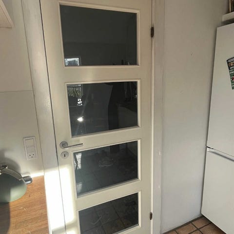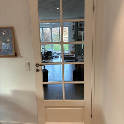 Døren er ca 62,5 cm bred og 185 cm. Høj. Den sorte skinne døren kører på er 2 meter lang.