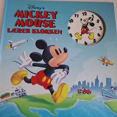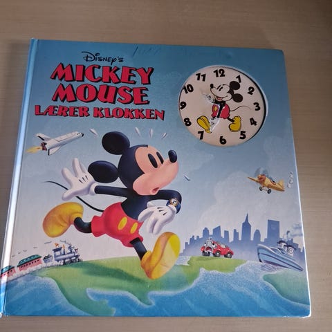 Mickey Mouse lærer klokken er fra Gyldendals Bogklub. Bogen har tykke sider og kommer fra røgfrit hjem.