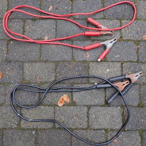 Par starter kabler. Hver 220 cm, i alt cirka 440 ved sammenkobling. Sælges kun samlet.