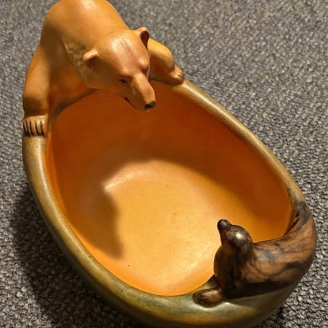 Royal Copenhagen vase med dyre- og plantemotiv. Vasen har en rund form med dekorative detaljer af dyr og blade. Farven er en kombination af jordfarver med grønne og brune nuancer. Fremstillet i keramik.