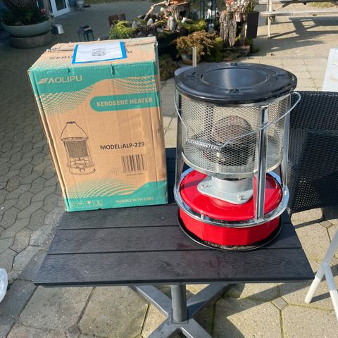 Heatmax petroleumsovn brugt men virker fint. 1000 kr med 6 liter petroleum (1 1/2 pose petroleum fra Harald Nyborg).