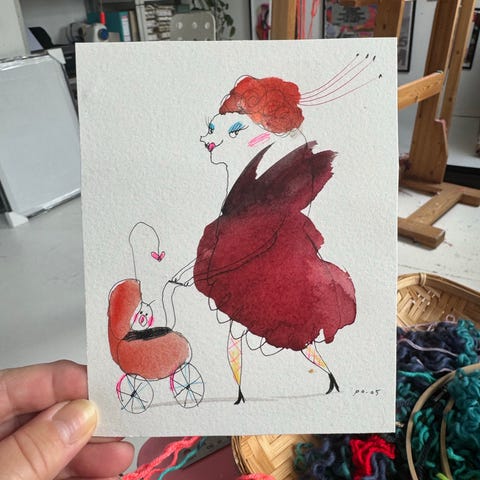 Håndmalet kunstmaleri med motiv af en mor med barn båret på ryggen. Maleriet har en abstrakt stil med brug af farverne orange, sort, hvid og blå. Motivet inkluderer også blå blomster på hvid baggrund. Maleriet er udført på lærred med tydelige penselstrøg og tekstur. Ca 0,5x0,5 m