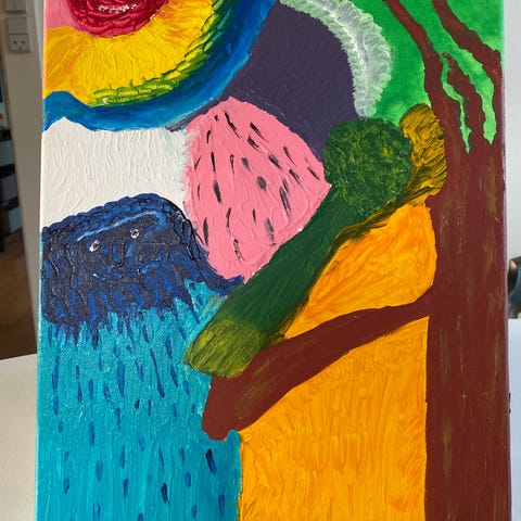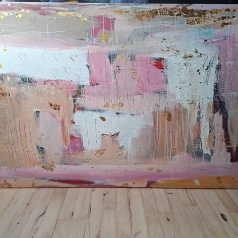 Maleri med abstrakt kvindefigur tegnet med sorte streger på lærred. Baggrunden har røde, gule og lyserøde farver i akryl. Maleriet måler cirka 50x50 cm og er udført på lærred med synlige teksturer.