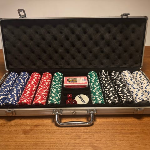 Pokerchips sæt med forskellige farvede chips, terninger og to sæt spillekort. Leveres i en aluminiumskuffert med håndtag og låse.