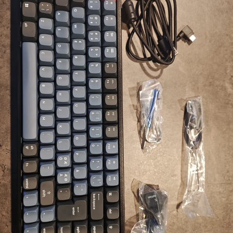 Mekanisk Keychron Q2 Pro tastatur i hvid farve. Tastaturet leveres med ekstra taster og værktøj til udskiftning af taster. Produktet er designet til brug med computere og henvender sig til brugere, der ønsker et mekanisk tastatur.