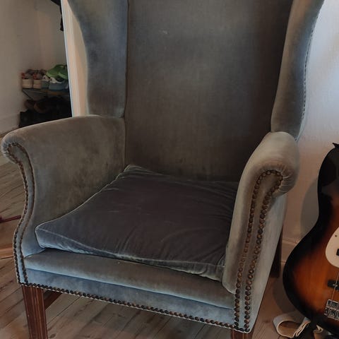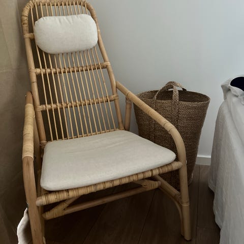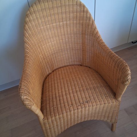 Fin og brugbar kurvestol med hynde. Kan afhentes snarest muligt på Amager. Er ikke tung, så kan fint løftes af en person. Står til straks afhentning i høj stuelejlighed.