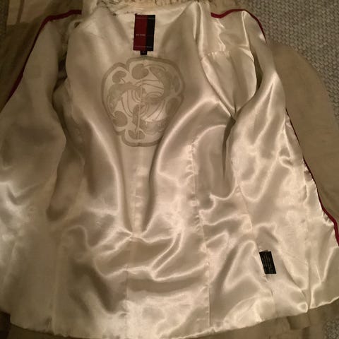 Flot snit og fine grønne detaljer indvendigt. To lommer. Bælte. Ingen pletter el. lign. Fin sommer jakke