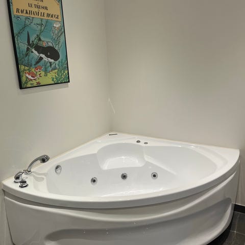 Hjørnebadekar i hvid og beige med armatur og bruser