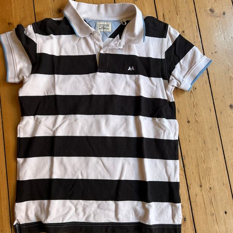 Lindbergh polo til mænd i størrelse L. Poloen har stribet mønster med farverne blå, hvid og orange, og den er lavet i et blødt materiale.