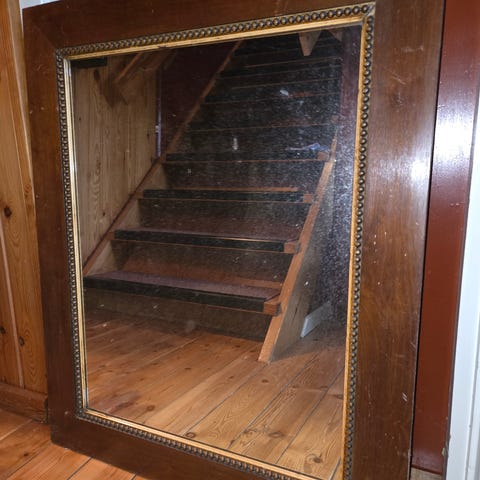 Spejl med mørk træramme, fremstillet i Sverige. Mål - B:50cm, H:112cm. God stand, se billeder. Kan afhentes Ryomgård 8550.