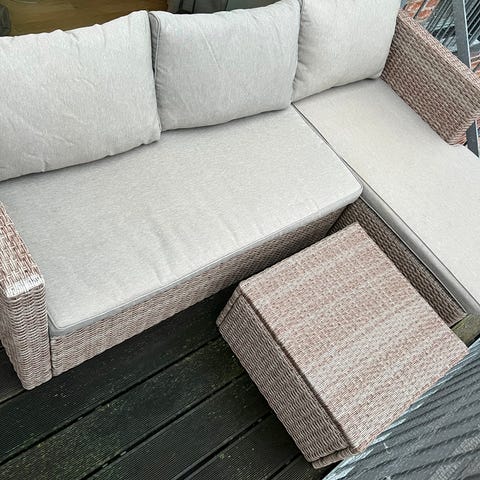 Hjørnesofa i grå med tilhørende grå hynder. Sofaen har en chaiselong-del og leveres med et sort glasbord med metalstel.