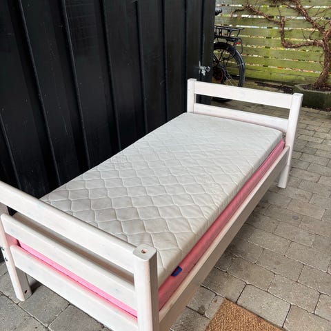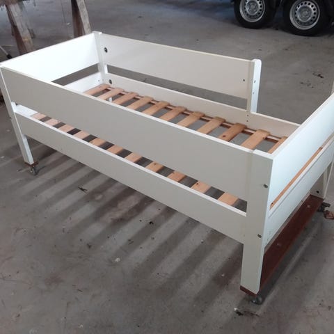 IKEA baby tremmeseng i hvid farve. Sengen har et design med tremmer og to opbevaringsskuffer under sengen. Materialet er træ. Sengen 60x120
