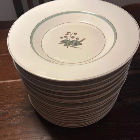 Stel bestående af flade og dybe tallerkener med grønne og brune dekorative motiver. Sættet er lavet i porcelæn og har en klassisk, enkel designstil. Velegnet til daglig brug eller til servering ved måltider.