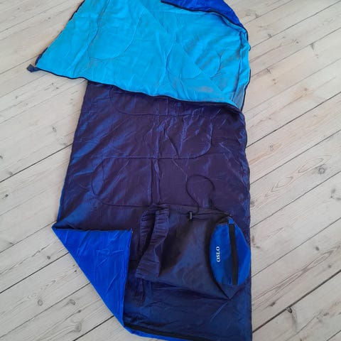 Sovepose i grøn farve med beige foer. Soveposen er designet til at give komfort under overnatning og er praktisk til udendørs brug.