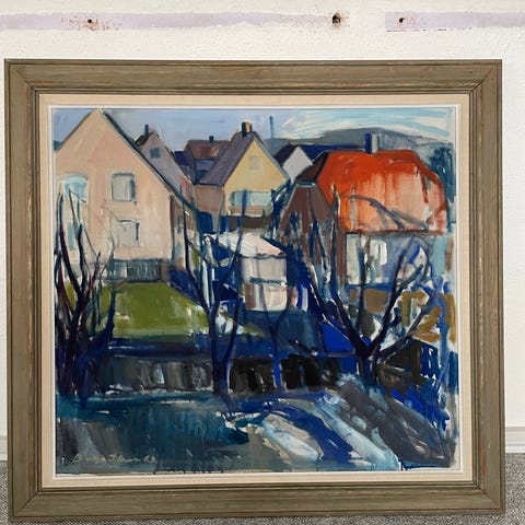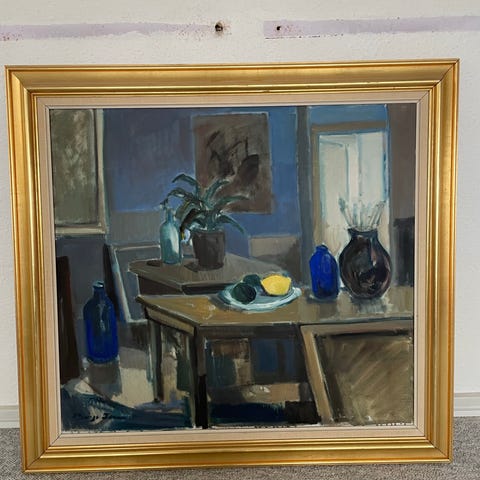 Børge Ibsen maleri med motiv af en skov. Maleriet er indrammet i en gylden ramme. Motivets farver domineres af grønne og blå nuancer, der skildrer træer og skygger. Der er et smukt lysindfald mellem træerne og billedet giver en rolig atmosfære i rummet