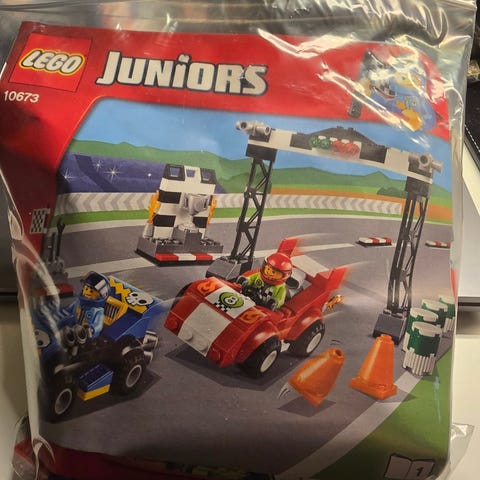 LEGO City Juniors 10683 sæt med arbejdskøretøjer og figurer. Indeholder en lastbil, en gravemaskine.