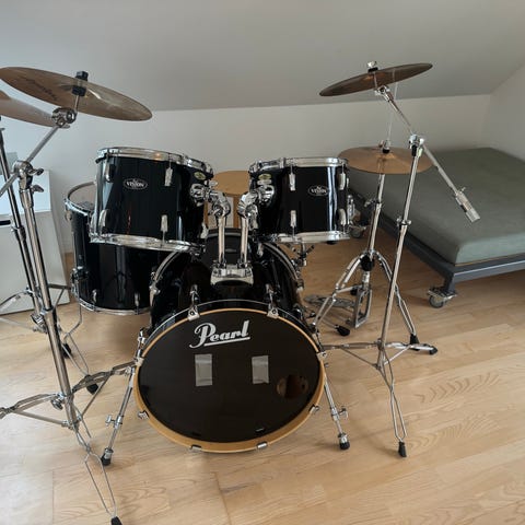 Komplet trommesæt Pearl Export Series 22 tommer. Pasties bækkener. 2 stk 402 + Pasties Dixie Medium Thin. Inklusive Pearl stol, trommestikker og Yamaha lilletromme til. Afhentes i Aarhus C. Sælges samlet.