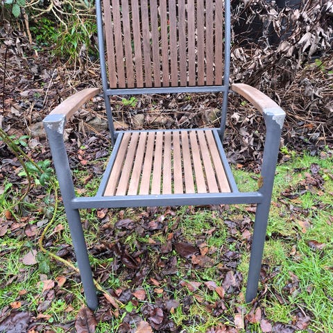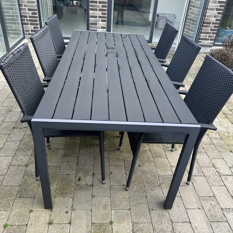 Havebord med udtræk op til 2 meter og 8 havestole med grønne hynder gives væk. Møblerne er lavet af teaktræ og metal. De er gode at stable..