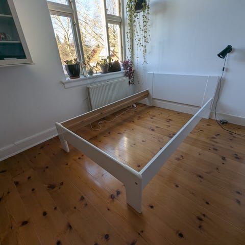 De har været brugt i en hjemmebygget højseng. Vi har selv tilpasset bredden, da vi ikke kunne finde lameller til en 120 madras.
