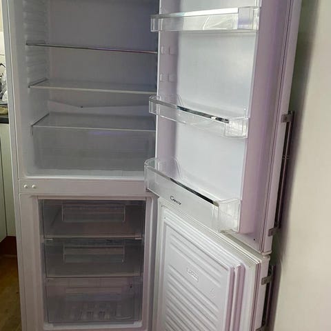 Candy køle-fryseskab i hvid farve. Produktet kombinerer køle- og frysefunktioner i én enhed. Skabet har hylder og skuffer til organisering af indhold.