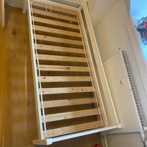 Fin børneseng med høje kanter. Kan trækkes ud. I mindste udgave: 90 cm lang. I længde 160 lang. Meget fin beige med tremmer. Tremmeseng. Gammel. Ingen skruer. Kan skilles af i to dele