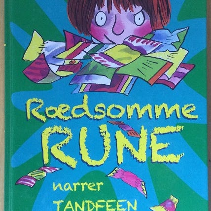Joanne Harris Runemarks bog. Fiktiv roman med fokus på nordisk mytologi og eventyr. Bogens omslag viser en rød og sort farvepalette med illustrationer relateret til runer