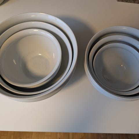 Eva Solo skålesæt bestående af to skåle i hvidt porcelæn. Sættet inkluderer en stor og en lille skål, begge med enkelt og funktionelt design. Skålene er velegnede til brug i køkkenet til servering og opbevaring af mad.