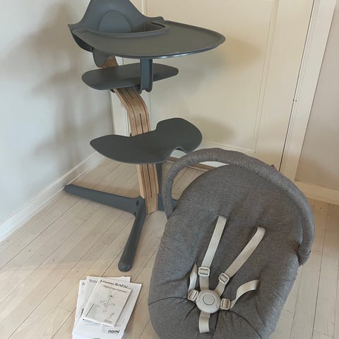 Fin sort nomi højstol, inklusiv babyindsat 0-6 måneder og bøjle. Stammen er helt ny aldrig brugt og alle plastik dele er intakt.